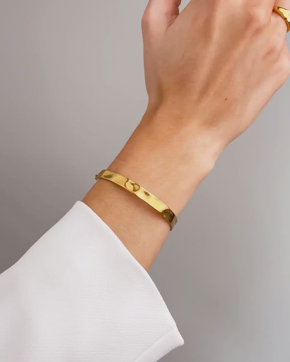 A classic design with a contemporary finish, our luxe gold hammered bangle features a subtle textured design and a chic, adjustable toggle closure for the perfect fit. The ideal accessory to elevate your every day look, the hammered bangle will become your new style staple.