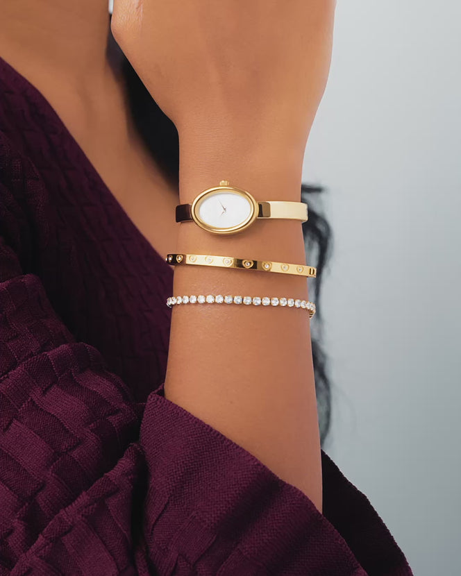 Add a touch of sparkle to your wrist with this effortless stack. Featuring our vintage-inspired Monroe Bangle Watch with a shimmering pearl oval dial, our crystal tennis bracelet and heart bangle, each piece catches the light just right. Designed to be worn all day, every day, it's the perfect set to gift or keep all to yourself.