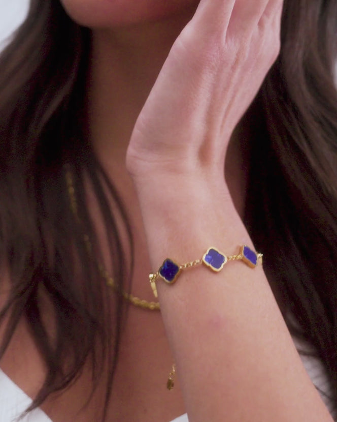 Blue lace agate stones are said to help you express your emotions, so let this 18k gold-plated bracelet help you be more true to you. From the Clover Collection, it features five clover charms and is perfect for everyday wear. Gift to yourself or someone you love.