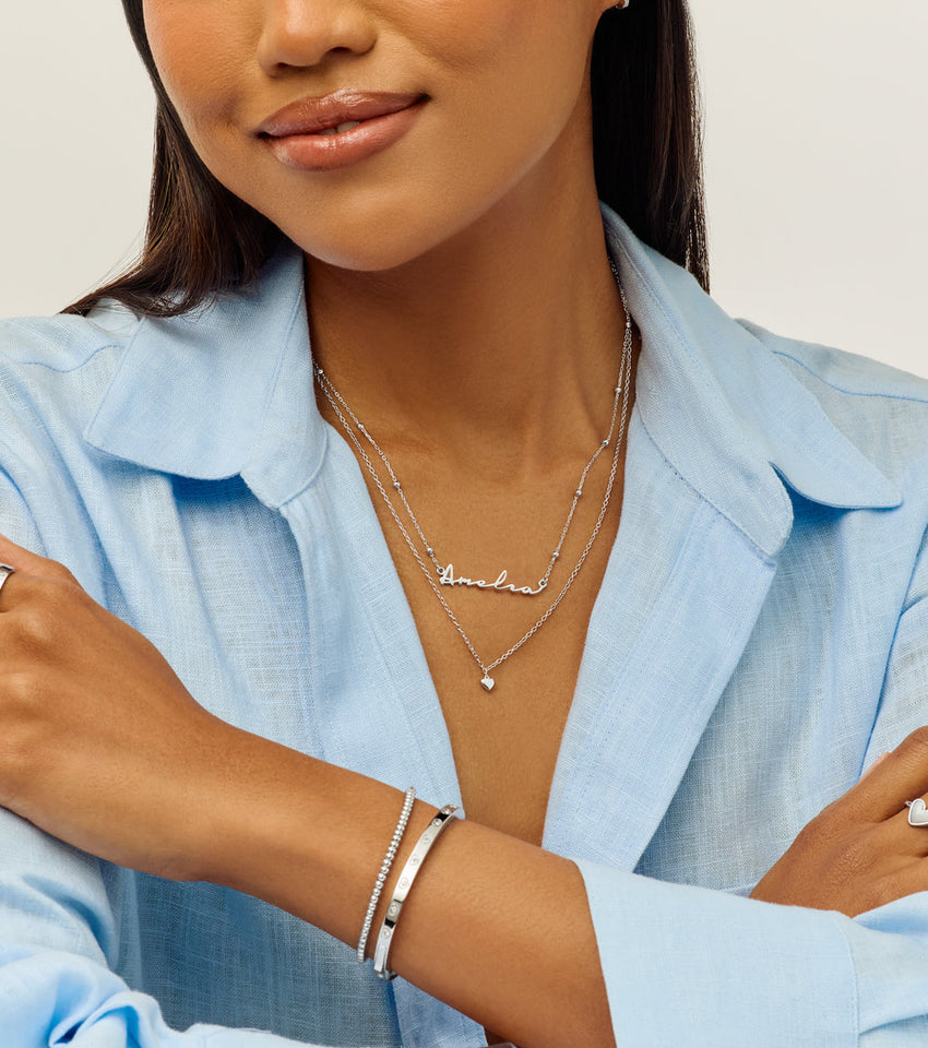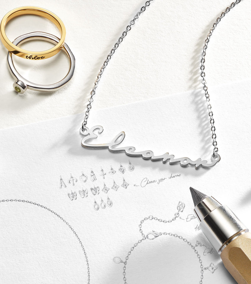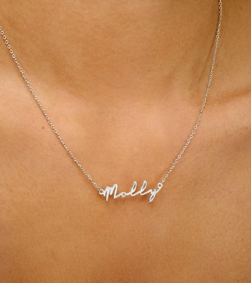 Discover your signature style with our iconic Name Jewellery, available in a variety of chains, colours, and designs. Crafted from rhodium-plated sterling silver, our timeless Signature Necklaces are built to last and completely unique to the wearer making for the perfect personalised gifts. Customise with up to 12 characters and choose your favourite chain to create a classic, bespoke Name Necklace that celebrates you or someone special.