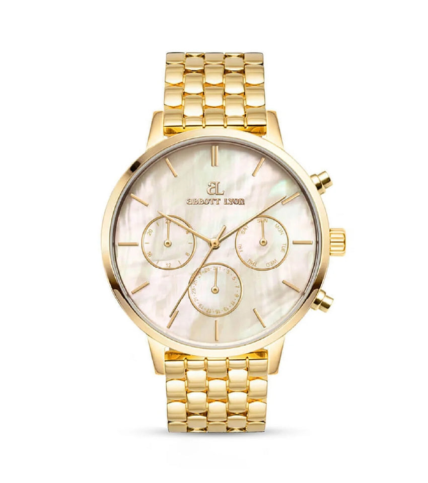 When this watch catches the light, heads turn. Gold stunningly complements the pearl face of our Gold Pearl Link Nueva with its super luxe link chain and ultra chic multifunctional details. This watch is a must-have this season, giving every look a touch of allure.