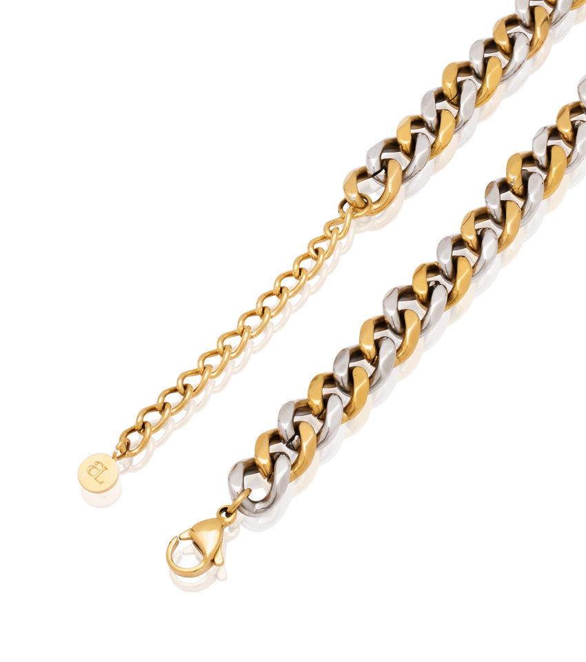 Our best selling choker-style curb chain has had a chic refresh with this statement two-tone finish. Made to order with the personalised initials of your choice, create a stunning bespoke necklace that's all about you or someone special, and style with a mix of gold and silver pieces for the ultimate cool girl look.