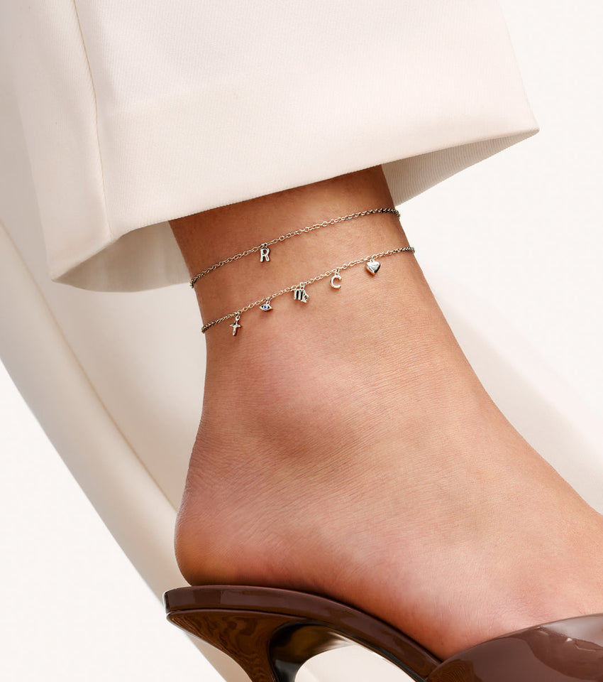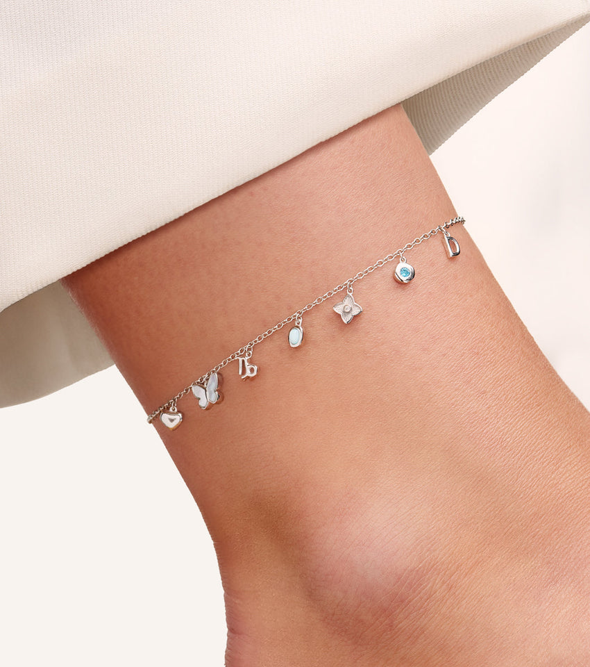 A dainty new addition to your favourite Made Mine Collection. For a luxurious finish, this fine anklet is crafted from certified 925 sterling silver with smoothly textured mini charms. Add up to six to build your story, from initials and pearls to hearts, flowers, and butterflies. The perfect gift for that special someone – this is personalised jewellery at its finest.