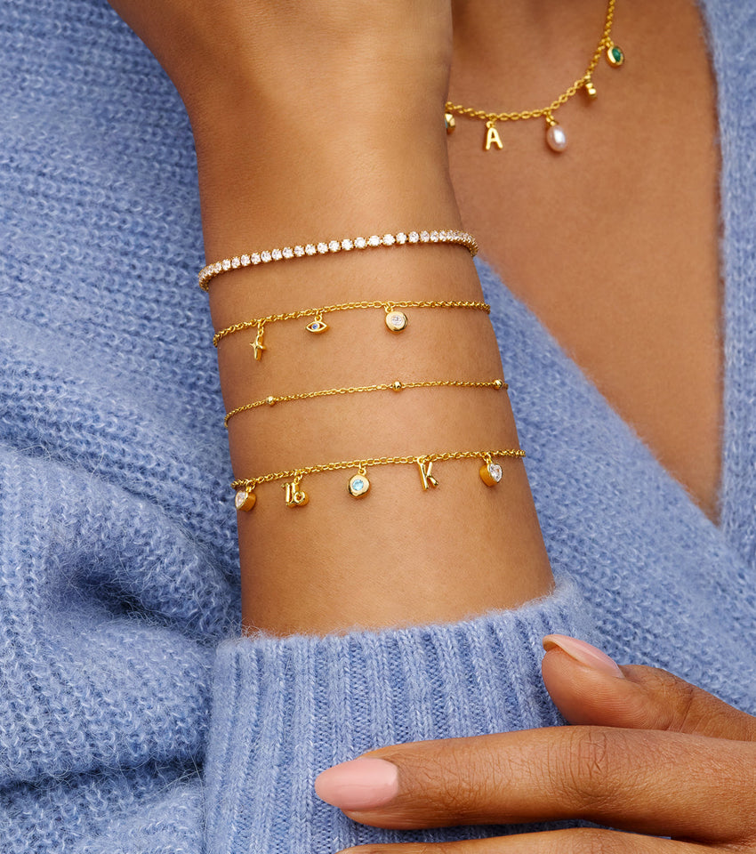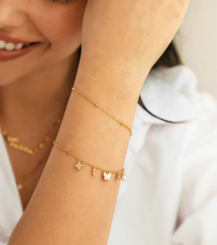 A dainty new addition to your favourite Made Mine Collection. Featuring mini molten charms, this fine bracelet is crafted from gold-plated certified 925 sterling silver for a luxurious finish. Add up to six to build your story, from initials and semi-precious birthstones to flowers and butterflies. The perfect gift for that special someone – this is personalised jewellery at its finest.