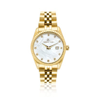 Our best selling Mini Belgravia watch has had a stunning gold update. Featuring luxe cubic zirconia minute markers for just the right touch of sparkle, and a premium pearl effect dial, this watch is finished a classic silver metal chain. With a dainty 30mm diameter, this beautiful designer-inspired piece will dress up any outfit.