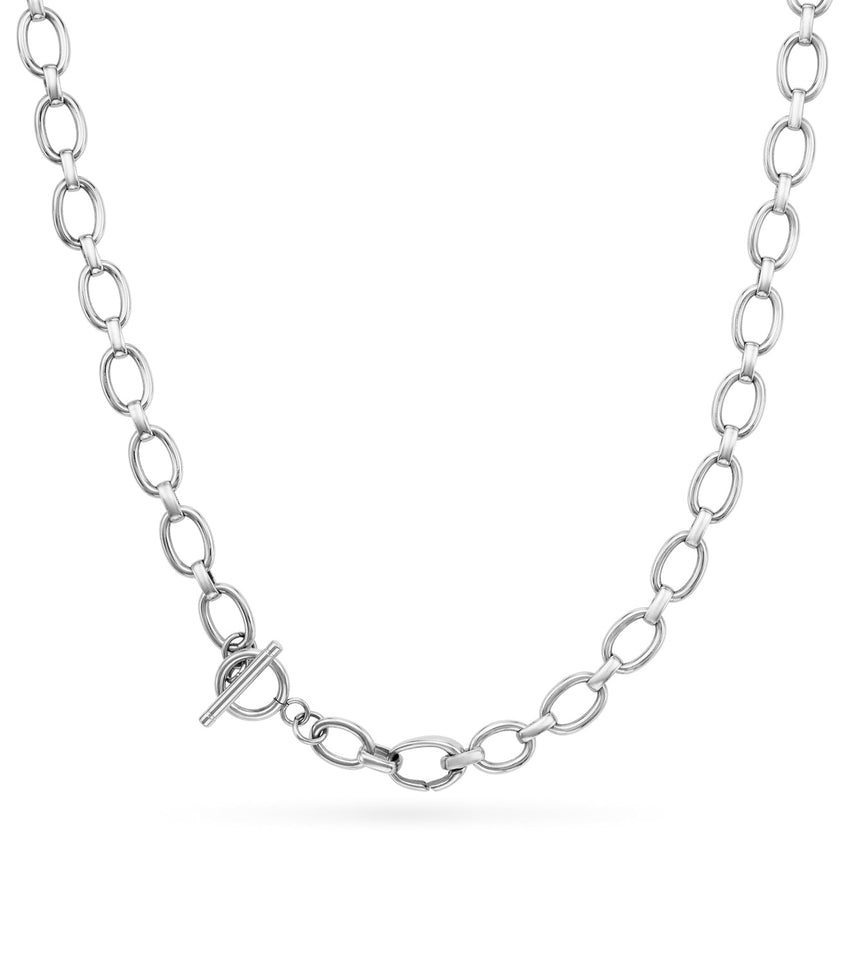 If you're a dainty necklace person, we love that, but we. think you'll still love this oversized silver chain. Its oval-shaped links and toggle clasp keep it refined, so you can still layer it with those finer chains. And, you can add a little more you to the necklace with charms or pendants.