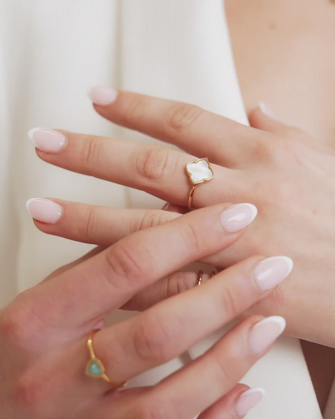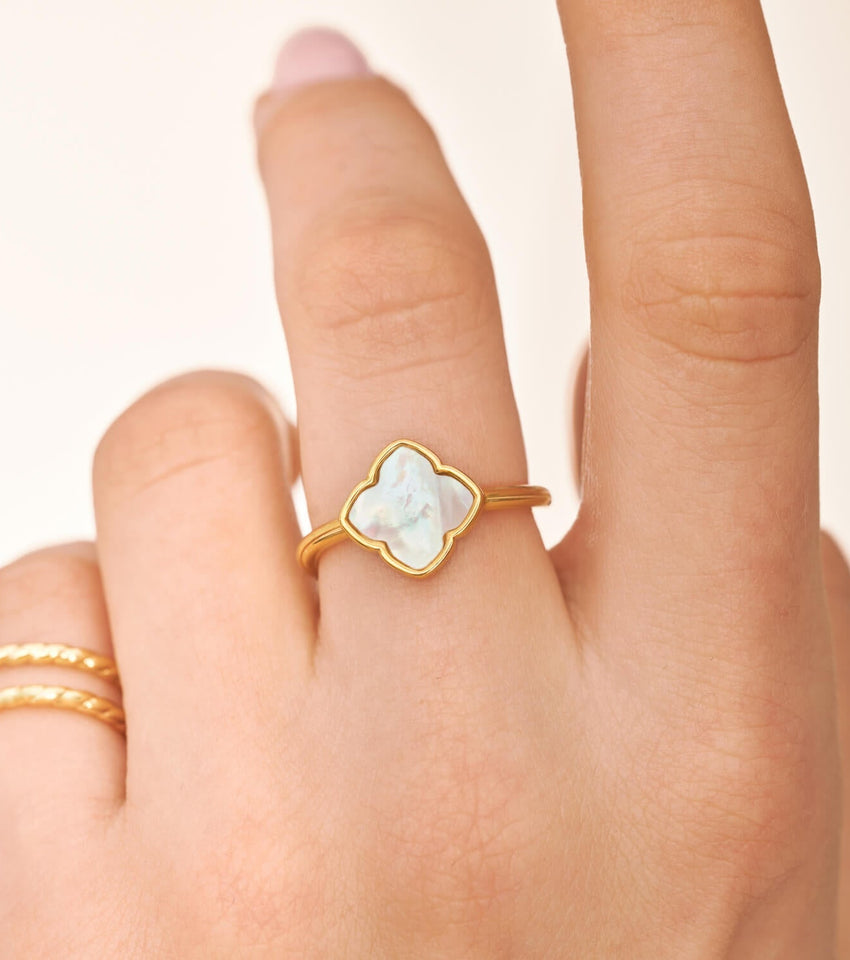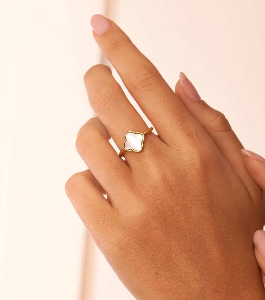 Featuring our newly-launched clover charm with a pearlescent centre, this gold-plated ring is cleverly designed with an adjustable spiral band for the perfect fit. Wear it with the matching earrings, necklace and bracelet, or stack it with your other Abbott Lyon rings.