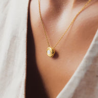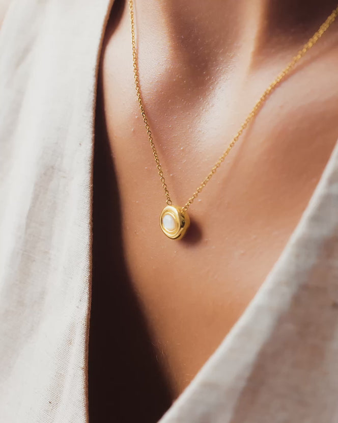 Inspired by vintage classics, our Pearl Molten Necklace blends an organic silhouette with timeless style. Featuring a fluid molten finish and a luminous mother of pearl centre, this unique piece adds a touch of understated luxury to your everyday look. Plated in 18k gold and fixed on a delicate chain, it’s perfect for layering or wearing solo for effortless elegance.