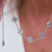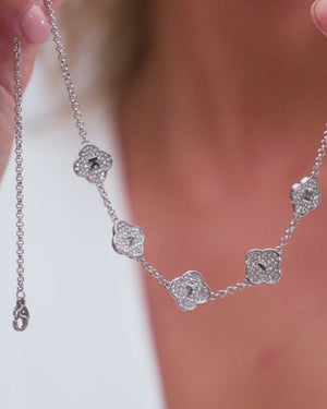 Take centre stage in this silver necklace with glittering cubic zirconia gems. Add shine to every outfit, whether dressing up everyday wear or add glamour to evening dresses. Choose up to ten clover charms that are either plain, letters from A to Z, a heart icon, or clover icon for a unique twist – it’s the perfect gift for a special friend.