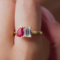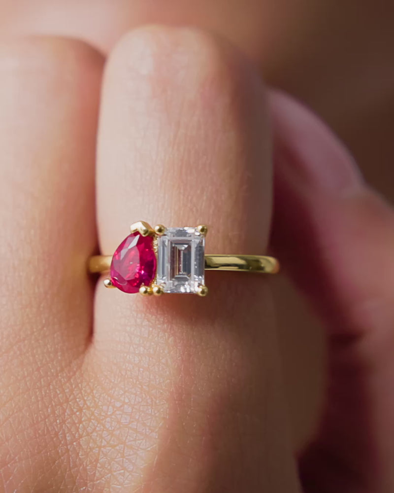 With an pear and emerald 5A grade cubic zirconia nestled together, our Toi Et Moi Ring symbolises the love of two people in full colour. Pick the two birthstone shades that mean the most – whether they are marking a love story, friendship or family. Each crystal is expertly cut and claw set to mirror the sparkle of a true diamond. The perfect gift for that special someone or yourself, this piece is made to last from 18k gold-plated sterling silver. Find your forever collection with our range of matching styles.
