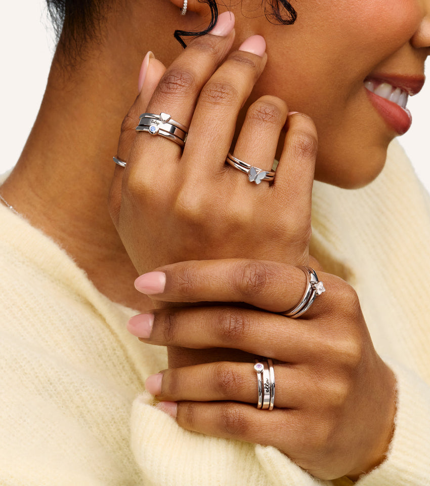 Discover our daintiest collection yet with the engravable Fine Script Name Ring. Made to order from 925 sterling silver, personalise with up to three engraved names and stack with our matching charm rings for the ultimate custom look.