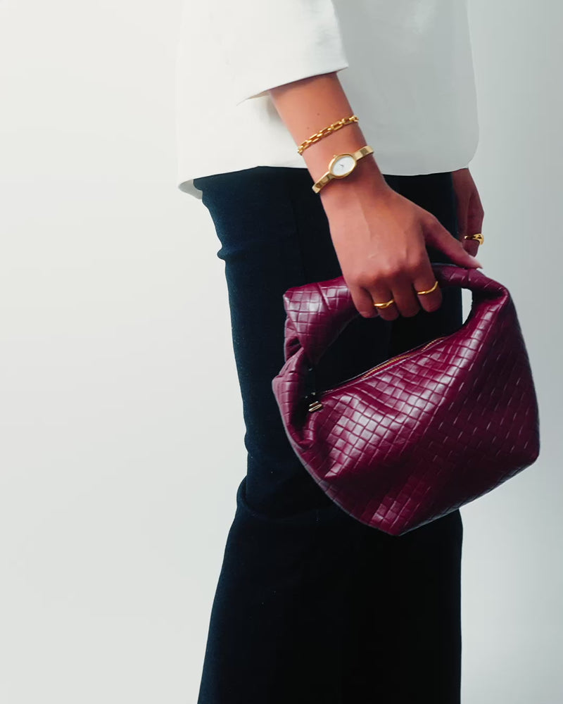Channel city chic with our favourite day-to-night mini bag. Crafted from genuine cowhide leather with a subtle embossed weave, it features a designer-inspired knot handle and an easy zip-top closure. The perfect grab-and-go piece of luxury, make it yours with a choice of Five dainty detachable bag charms.