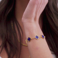 Blue lace agate stones are said to help you express your emotions, so let this 18k gold-plated bracelet help you be more true to you. From the Clover Collection, it features five clover charms and is perfect for everyday wear. Gift to yourself or someone you love.