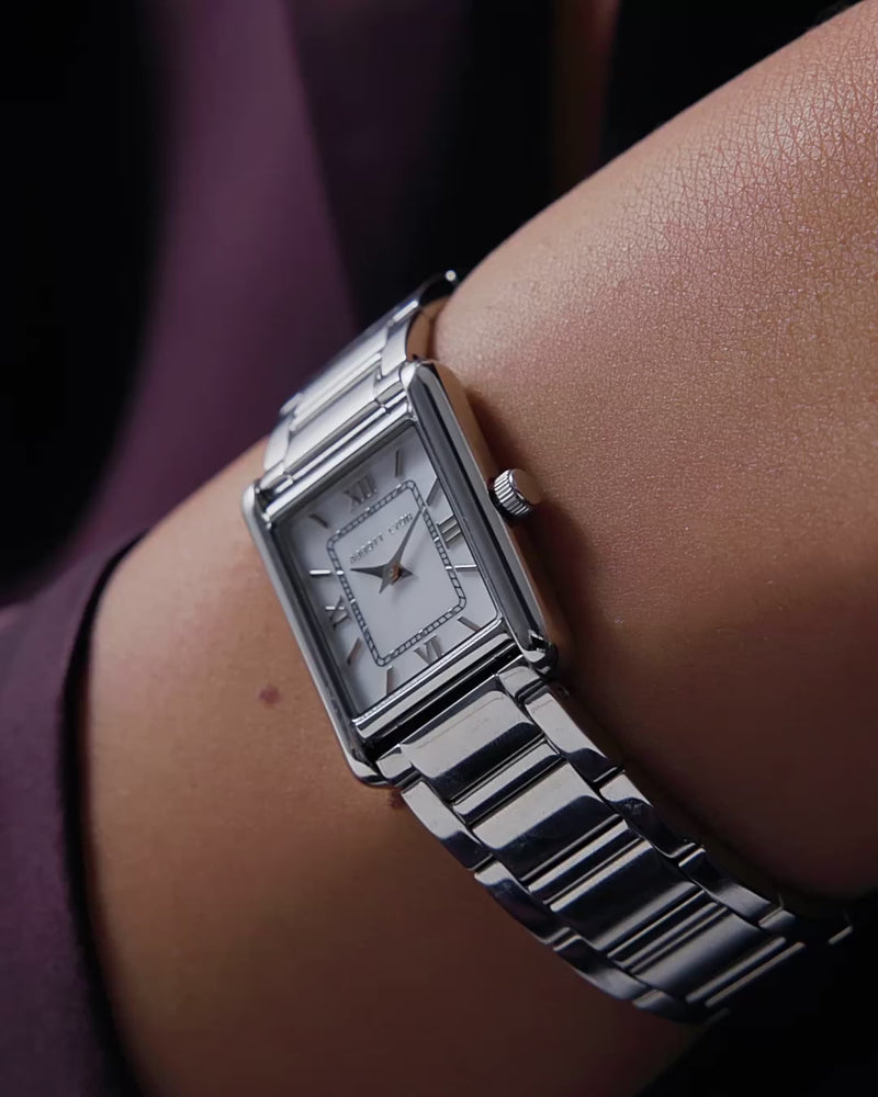Elegant and understated, our new Tank Watch brings a touch of vintage inspiration to the everyday. With its retro-style rectangular dial in faux mother-of-pearl and a silver-plated stainless steel bracelet, it’s designed for timeless wear. The H-shaped link bracelet tapers subtly for a refined, comfortable fit — a modern classic you’ll reach for again and again.