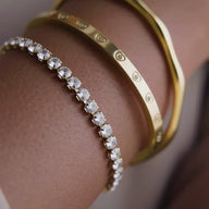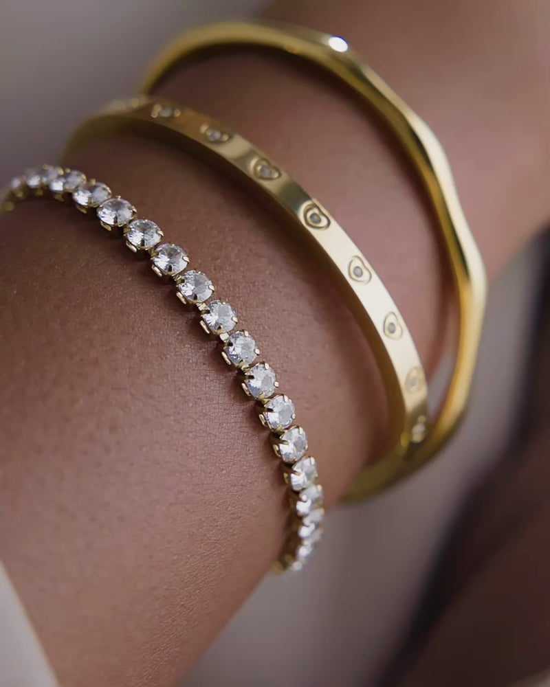 The golden stack of dreams – this trio features our Crystal Heart Bangle, Molten Bangle, and classic Tennis Bracelet. The heart bangle sparkles with dainty cubic zirconias, the molten bangle adds modern sculptural style, and the crystal-set tennis style brings timeless shimmer. Layer them together for a statement look or wear solo for a touch of everyday elegance.