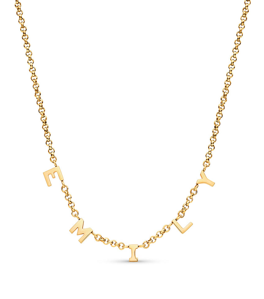 A fresh update on our best-selling custom name necklace. Timeless and truly personal, it features individual letters to spell out the name or word of your choice. The perfect gift for that special someone, each handmade piece is the ultimate way to show them you know them. Play with up to 10 characters and add the charms of your choice to create a bespoke necklace that celebrates your individuality or the person you love.