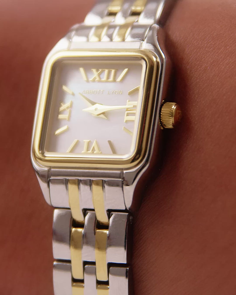 Your favourite watch just got a mini update... Same Five-toned silver and gold combo, even sleeker design and style. Built to last from stainless steel, the mixed metals and pearlescent dial mean you can dress it up and down, no matter the occasion. It also make a super special gift to give someone you love... or from you to you.