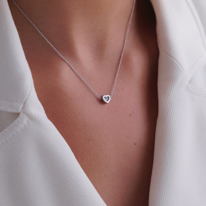 Filled with a subtle sparkle, this floating heart necklace is an elevated addition to your everyday style. Crafted in platinum plating, the chain is finished with a single stone encased in a clear glass heart. Effortlessly stylish and endlessly wearable, this necklace is a thoughtful gift to yourself or someone special. Wear it solo or pair it with the matching floating heart studs for a layered look.