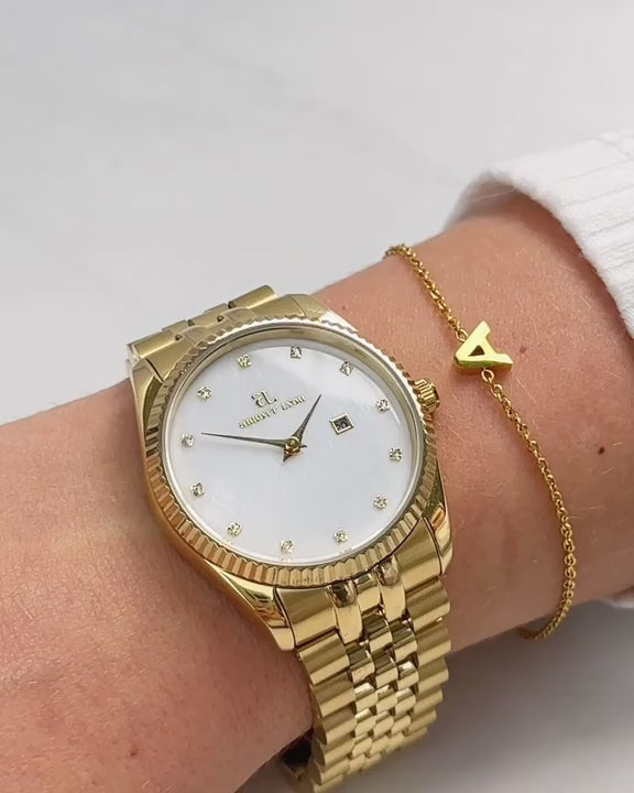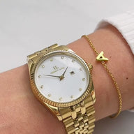 Our Belgravia watch is a best-seller, thanks to its timeless silhouette and eye-catching features. Luxe cubic zirconia minute markers add a touch of sparkle against the premium pearl-effect dial, and the gold link strap makes this watch a classic piece, and a classic gift.