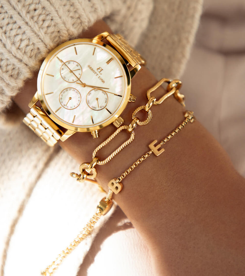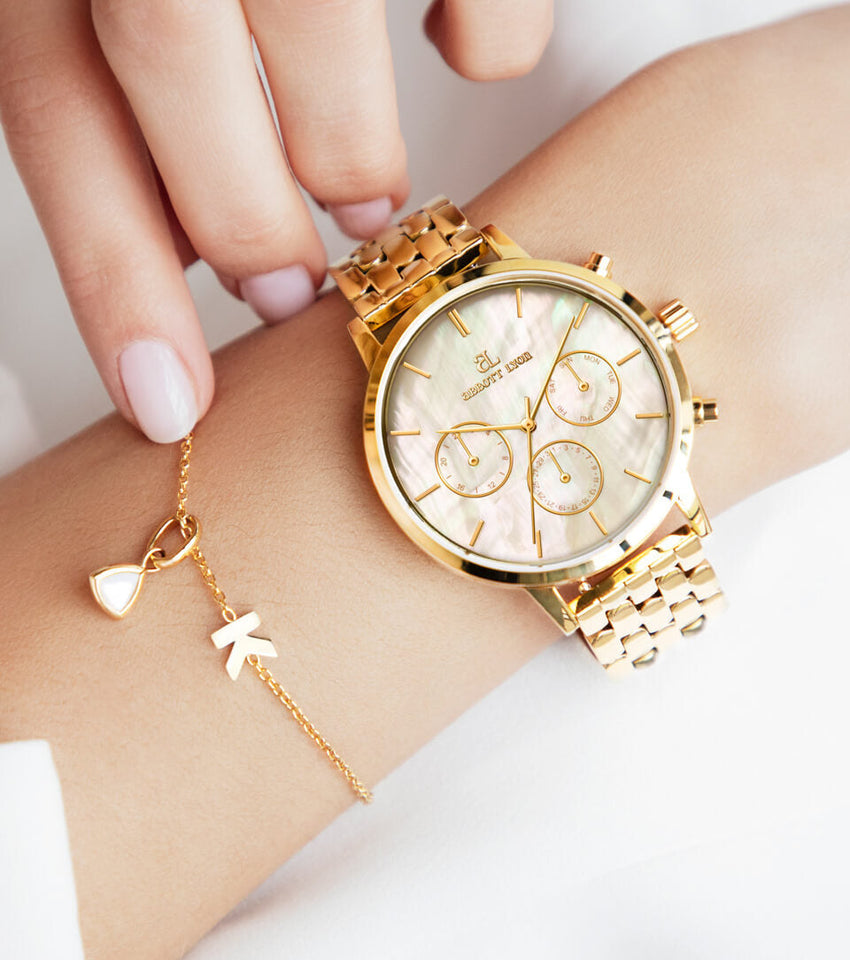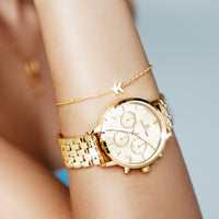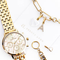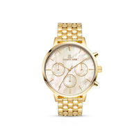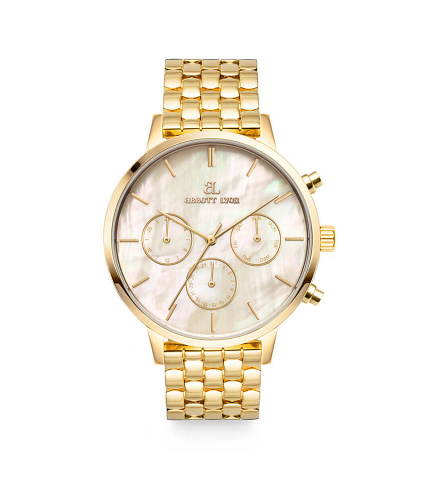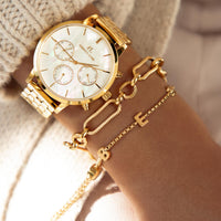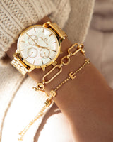 When this watch catches the light, heads turn. Gold stunningly complements the pearl face of our Gold Pearl Link Nueva with its super luxe link chain and ultra chic multifunctional details. This watch is a must-have this season, giving every look a touch of allure.