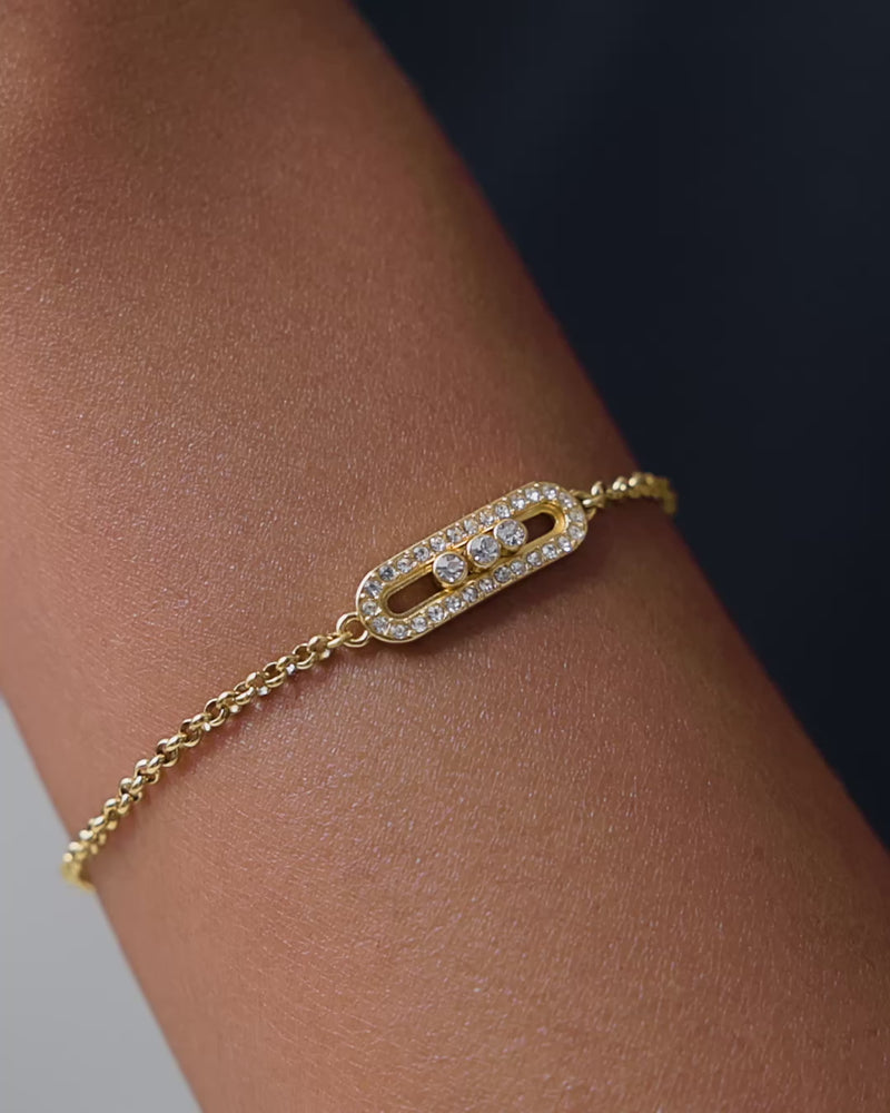 Designed to sparkle — and soothe. Featuring three dainty kinetic crystals that glide smoothly with your movement, this pavé fidget bracelet brings calm and comfort when you need it most. Finished in 18k gold plating with glistening stones, it’s a touch of everyday luxury you've been waiting for — pair it with the matching necklace to complete the look.