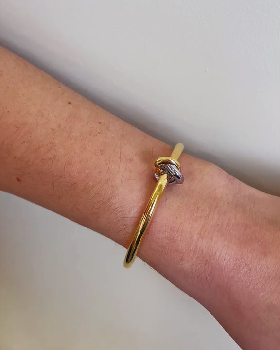 Featuring a classic design with a contemporary finish, our premium gold bangle features a chic knot detail with a subtle touch of silver. The perfect accessory to elevate your every day look, this timeless bangle will become your new style staple.Need to Know