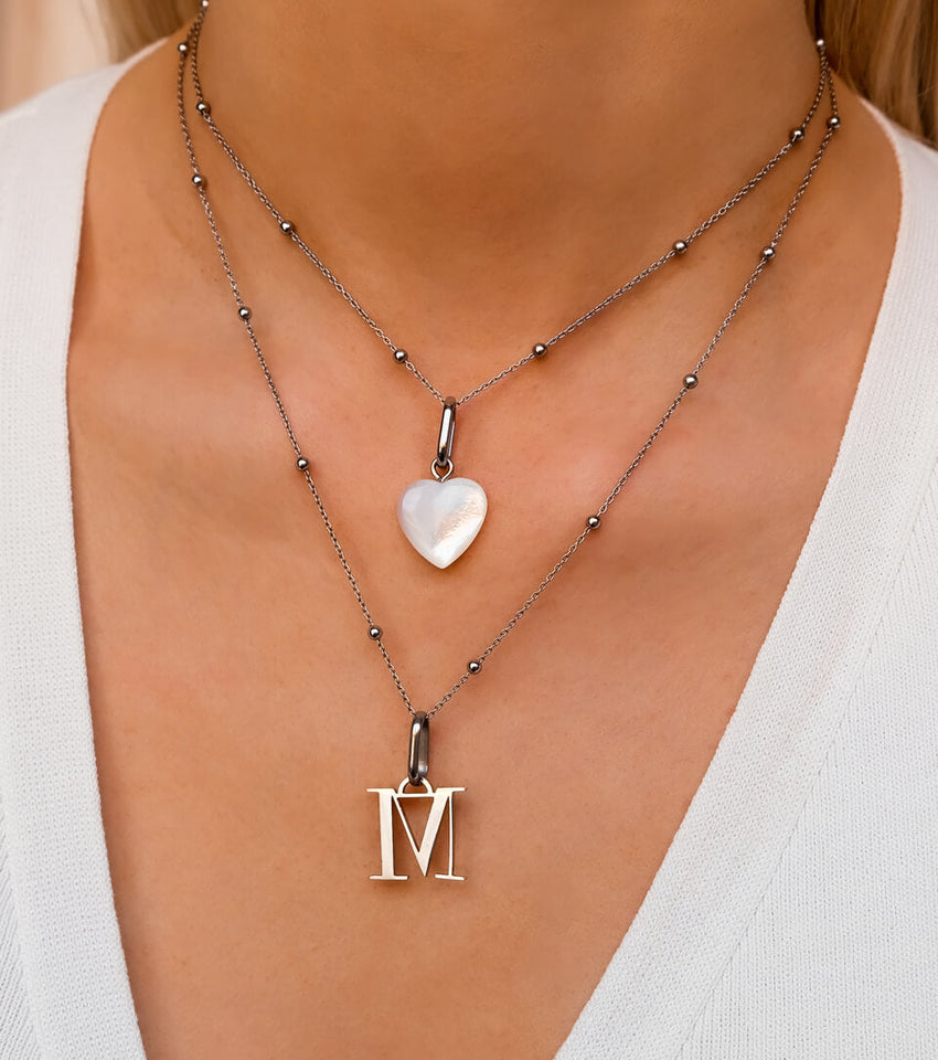 We've done the styling for you with our beautiful collection of layered sets. Our most wanted chains and pendants have been curated into effortlessly stylish combinations to create the must-have luxe layered look that will complete every outfit. Here we've paired our classic silver Sphere Chain necklaces with the best-selling heart-shaped Birthstone and editorial Letter Pendants of your choice to create a statement look that is unique to you.