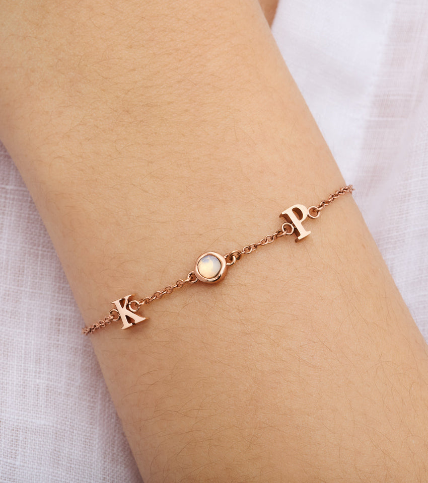 Meet the latest update to our best-selling initial and birthstone bracelet. Featuring two initials and one birthstone, you can now choose the font and stone style for an extra personal touch. Whether it's a token of self-love or a gift for that special someone, create a bespoke piece that symbolises true individuality. Dressed up or down, this dainty design is made to celebrate you (or them) every day.