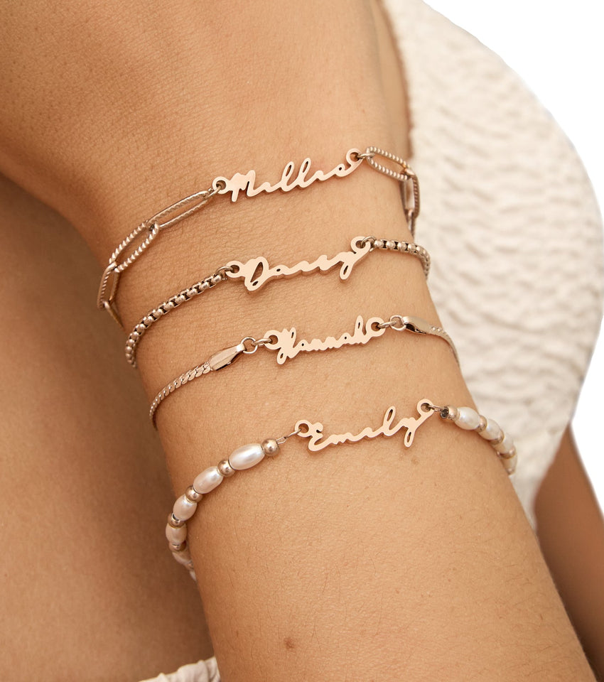 A super sweet update to our best-selling name bracelet, the Mini Signature features a pretty, smaller version of our iconic font in the name or word of your choice. Handmade and totally unique to you, play with up to 12 characters and select your favourite chain to create the ultimate bespoke bracelet, perfect to wear every day.