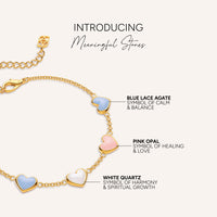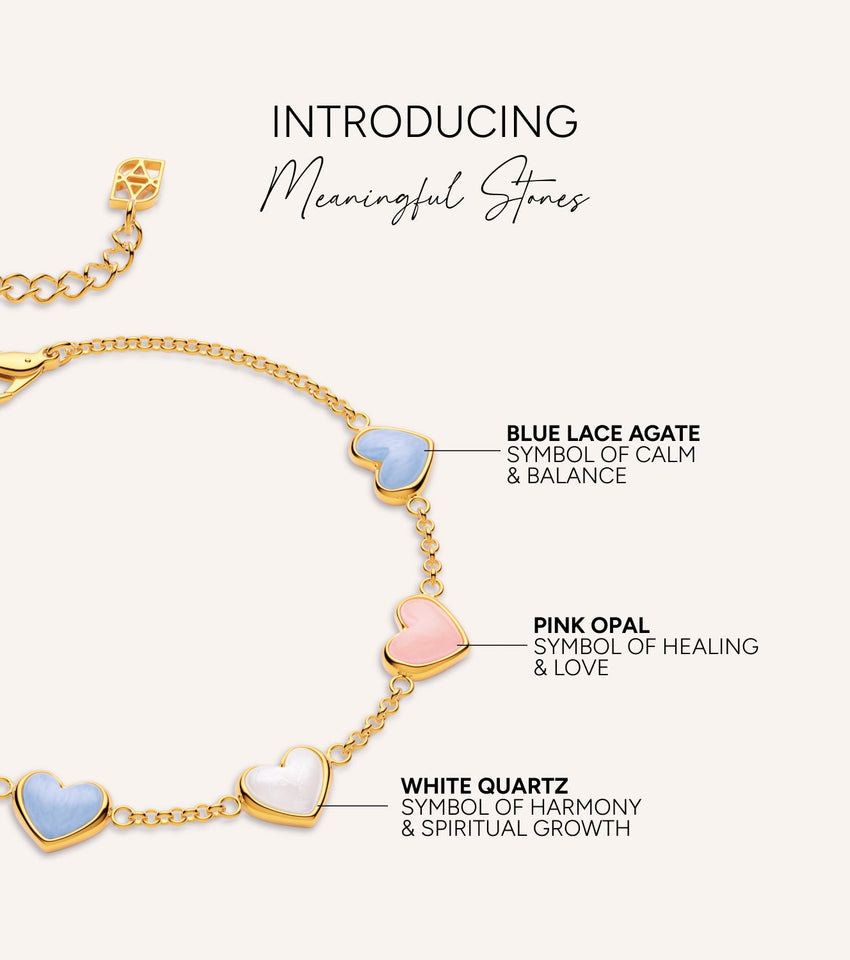 Add a touch of love to your bracelet collection. This luxurious multi-heart piece features three meaningful stones to guide and protect you - white quartz for harmony, blue lace agate for emotional balance and pink opal for protection. A dreamy mix of pastel shades, it makes the perfect gift this season and beyond.