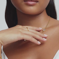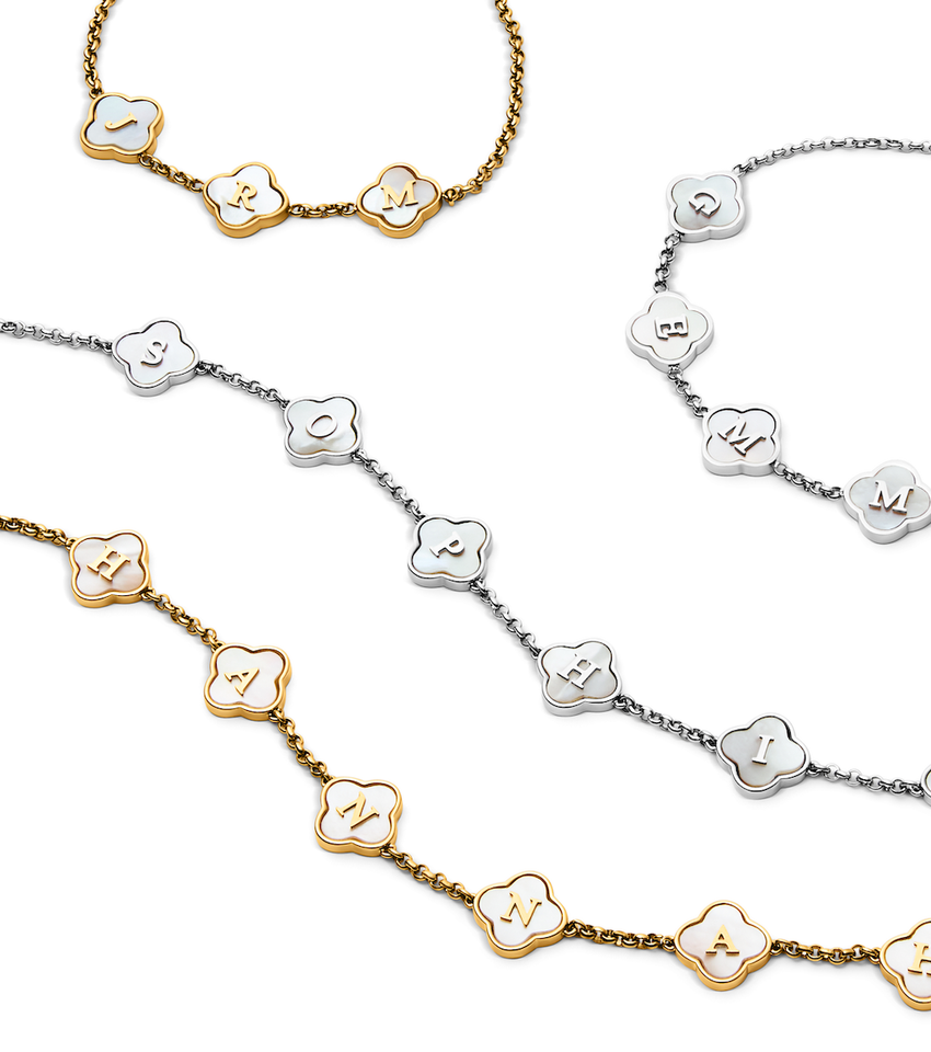 Finished in gorgeous mother of pearl, our designer-inspired clover necklace is the perfect personalised accessory. Complete with the initials, birthstones or icons of your choice, stack with other necklace chains to create the ultimate layered look.