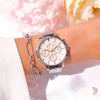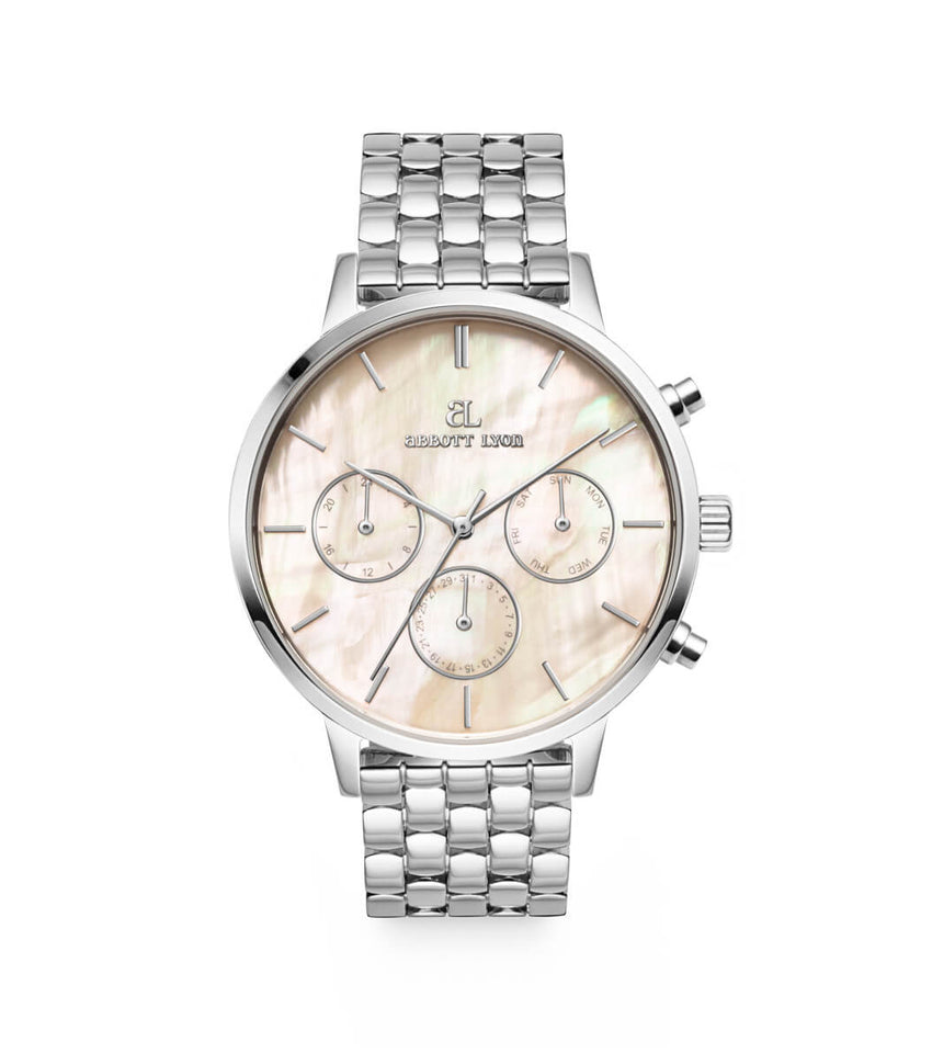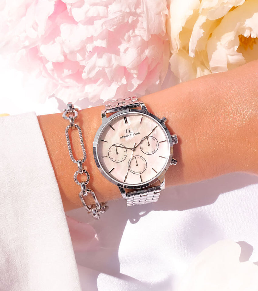 When this watch catches the light, heads turn. Silver stunningly complements the pearl face of our Silver Pearl Link Nueva with its super luxe link chain and ultra chic multifunctional details. This watch is a must-have this season, giving every look a touch of allure.