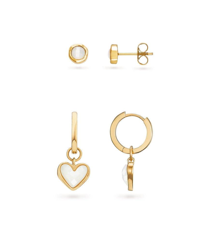 We've done the styling for you our best selling earrings have been carefully curated into effortlessly stylish combinations to create the trending stacked look of the season. Here, we've paired our gorgeous white quartz heart huggie earrings with the classic white quartz stud earrings for an easy set you can use to add a pretty touch of sparkle to any look.