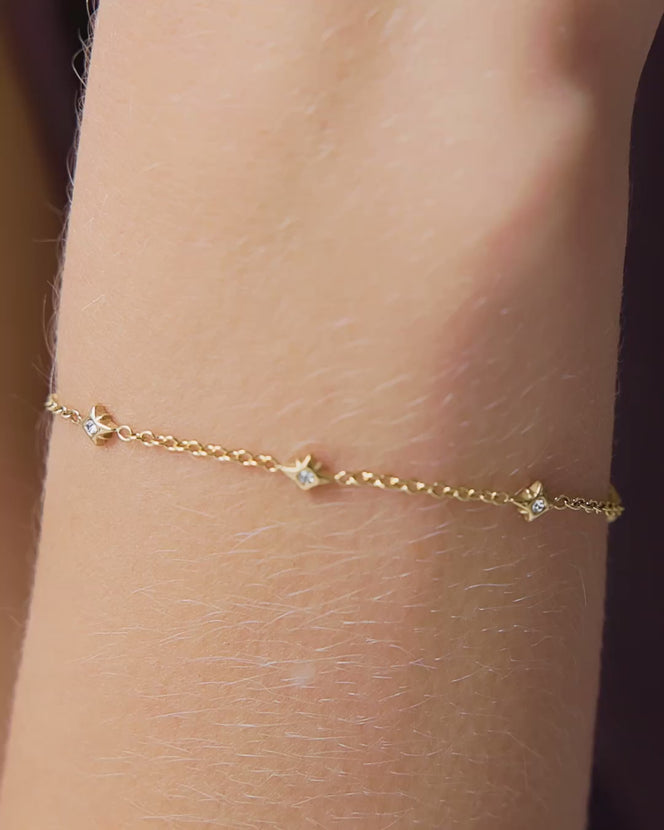 Part of Stacey Solomon's Written In The Stars collection, this gold chain bracelet brings a subtle celestial sparkle to your everyday style. Delicate star charms are spaced along the chain, each set with a clear preciosa stone at the centre. The perfect gift for yourself or someone special — pair with our personalised Written In The Stars tag necklaces for a dreamy and meaningful look.