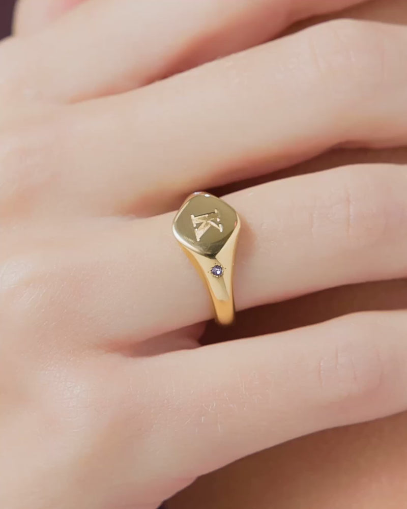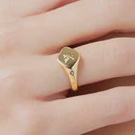 Part of Stacey Solomon's Written In The Stars collection, this signet ring celebrates unbreakable bonds. Personalise it with an embossed initial and choose two preciosa stones either side of the band — pick two matching or contrasting birthstone colours for a truly unique piece. Perfect for stacking with daintier rings or wearing solo as a subtle statement of love and personal style.